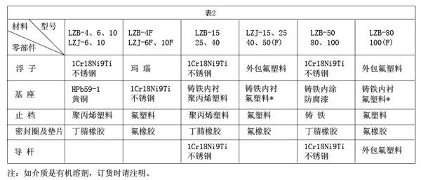 1)注:“*”為擴展流量范圍,防腐型其浮子材質為不銹鋼材質。