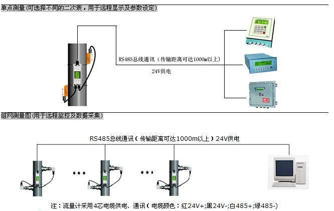 一次表與二次表(或計(jì)算機(jī))之間采用RS-485總線通訊,采用普通電纜即可,傳輸距離可達(dá)1000米以上,組網(wǎng)十分方便、快捷。這種傳輸方式抗干擾能力強(qiáng),解決了分體式超聲波流量計(jì)專用電纜成本高、抗干擾能力差、傳輸距離短等問(wèn)題。