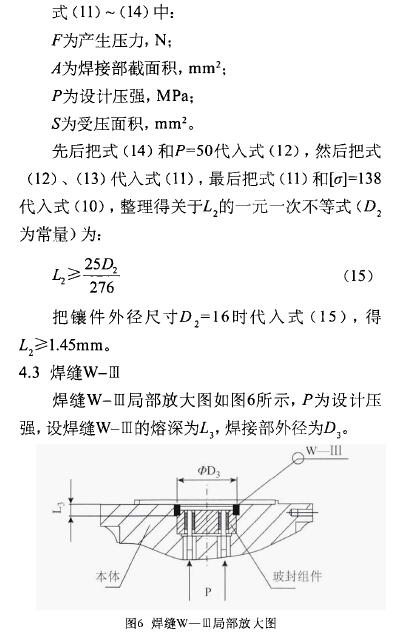 顯然,焊縫W-III即本體和玻封組件焊接部與焊縫W-II的結構型式完全相似,所以計算方法完全相同。設焊縫W-III的熔深L3,焊接部外徑為D3,同理可得L3與D3的數學關系式為: