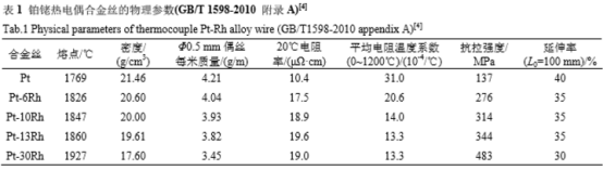 貴金屬熱電偶與廉金屬熱電偶相比具有測溫精度高,穩定性好、測溫溫區寬、使用壽命長等諸多優點。因其物理、化學性能良好,高溫下抗氧化性強及熱電勢穩定性好,多用于一些精密測溫的領域,一些特殊的貴金屬熱電偶也用作溫度傳遞的標準。鉑銠合金具有諸多優點,如:熔點高、催化活性好、熱電性能穩定、高溫持久強度高、抗腐蝕性好和高溫抗氧化性強等,鉑和鉑銠合金因此成為貴金屬熱電偶的組成材料是鉑和鉑銠合金,表1列出了常見鉑銠熱電偶絲的一些物理性能。