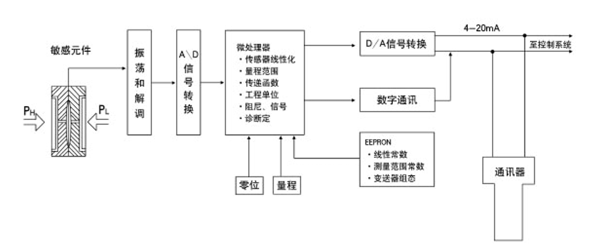 差壓變送器的核心是一個電容式傳感器,稱為“S”室。傳感器是一個完全密封的組件,過程壓力通過隔離膜片和灌充液硅油傳到傳感膜片引起位移。傳感膜片和兩電容極板之間的電容差由電子部件轉換成4~20mADC的二線制輸出的電信號。