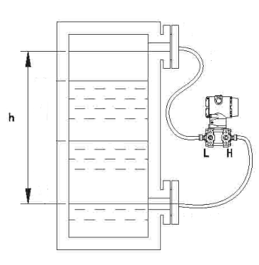 如圖所示,高壓室法蘭與容器低端法蘭相接,而低壓室法蘭安裝在與高壓室法蘭同一水平線上的大氣中。那么變送器量程為L=H·ρ