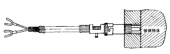WRNT-01、WRET-01型壓簧式固定熱電偶的安裝方法如下圖所示,固定安裝在被測(cè)物體上面,先將連接螺栓擰緊在被測(cè) 物體上,再將熱電偶緊貼被測(cè)物,擰緊卡套螺釘,最后擰上鎖緊卡套。