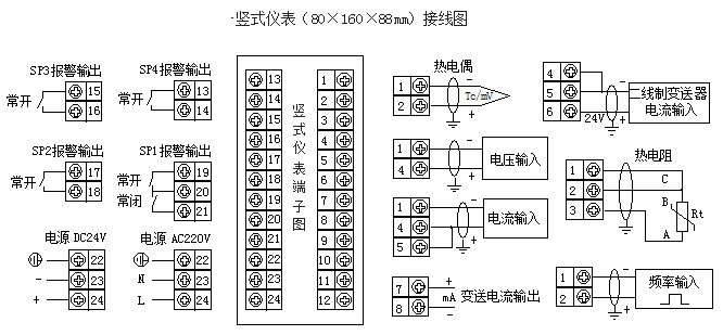 e)帶24V直流電源輸出的儀表,僅用于與二線制4-20mA輸出的無源變送器配套。該電源在儀表內(nèi)部與輸入采樣電路連接,不可作為其它電源使用。
