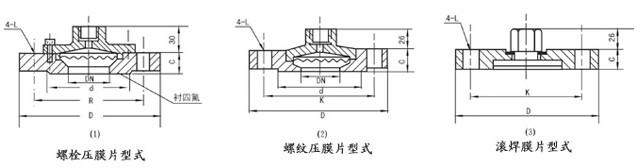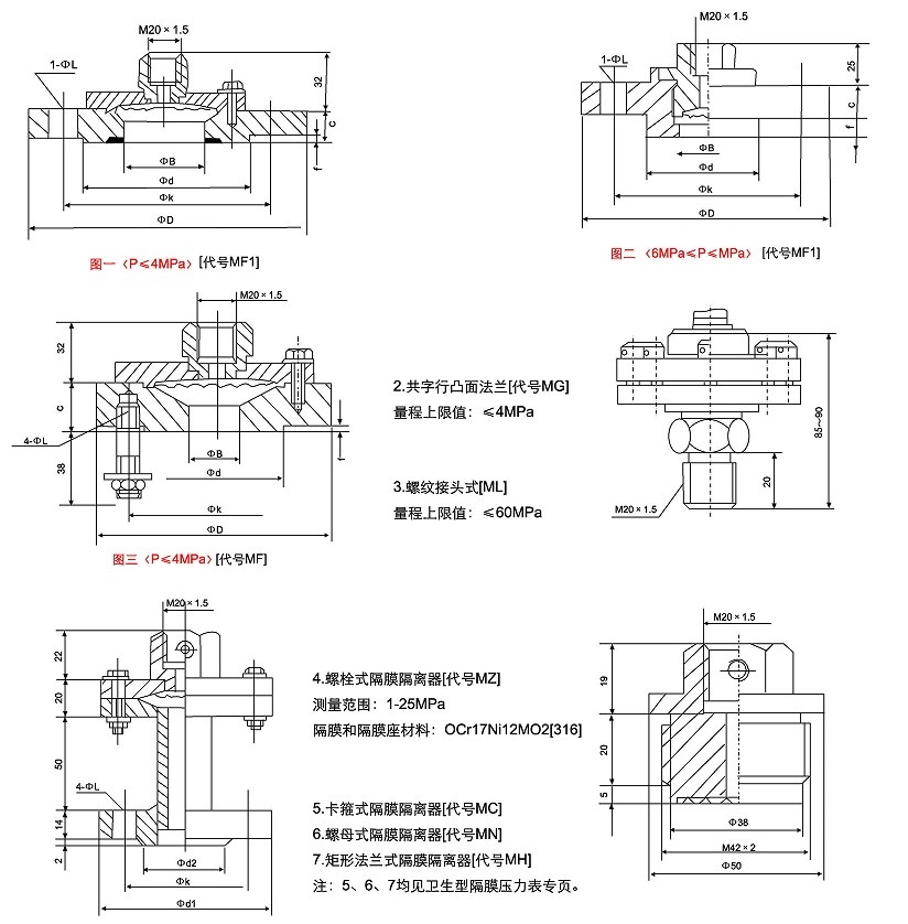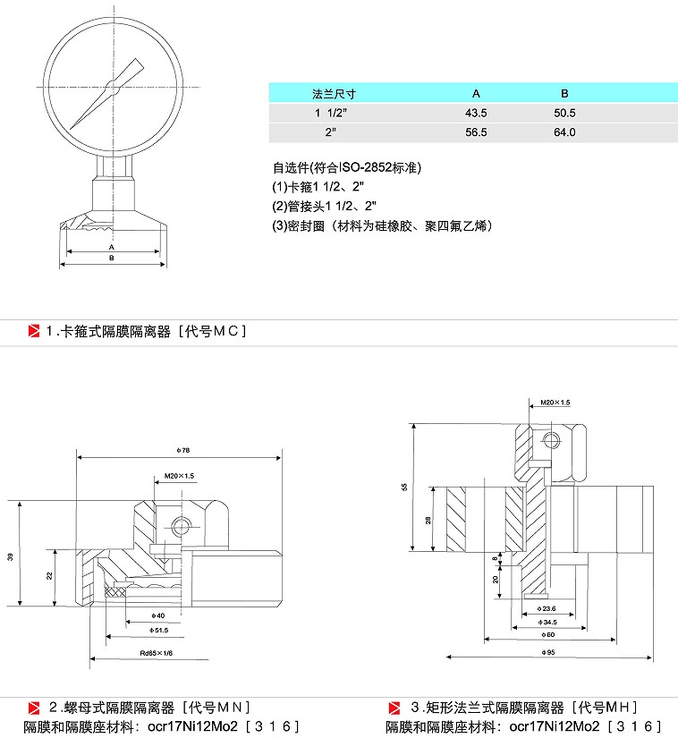 注:隔膜壓力表根據(jù)隔膜體連接方式不同不僅可以做成以上的螺紋連接、法蘭連接、衛(wèi)生型卡盤連接,還可以做成管道式隔膜壓力表,管道式隔膜壓力表連接根據(jù)不同的安裝需要有卡盤式、螺紋式、對夾式等等。