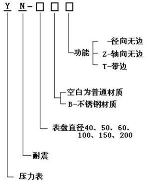 選型說明:功能選型中“T”僅適用于Φ60 Φ100 Φ150表盤的壓力表
