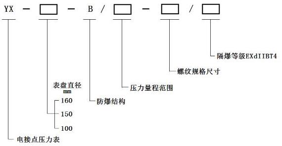 YX-160B(150B 100B)防爆電接點(diǎn)壓力表的工作原理是基于檢測(cè)元件(測(cè)量系統(tǒng)中的彈簧管)的彈性變形,通過(guò)機(jī)械傳動(dòng)使之帶動(dòng)電接點(diǎn)組中的觸頭產(chǎn)生相應(yīng)的動(dòng)作(閉合或斷開(kāi))以使控壓系統(tǒng)中的電路得以接通或斷開(kāi),從而實(shí)現(xiàn)自動(dòng)控制報(bào)警和現(xiàn)場(chǎng)指示的目的。
