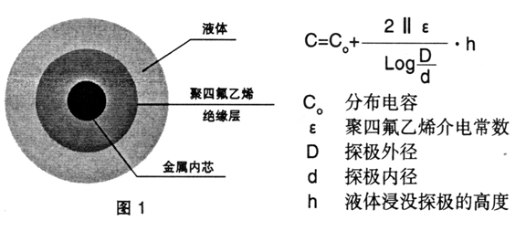 射頻電容液位變送器測量原理為探級與導電液體構成一電容器,其中探級線的金屬內芯為電容的一極,導電液體為電容的另一極,中間為高穩定性的聚四氟乙烯,即探級線的絕緣外層作為兩極之間的介質,隨著液位的變化,液體包圍探級線的面積隨之改變,使構成電容器兩極的相對面積改變,導致電容的變化,根據同心筒狀電容的公式可寫出液位高度與電容的關系:
