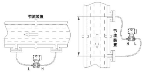 對不能用導(dǎo)壓管引出的介質(zhì),可用雙法蘭差壓變送器進(jìn)行流量測量,其裝置見下圖,測量水平管道時(shí),兩法蘭同在一水平面上,不存在液位差,不考慮遷移,測量垂直管道是,始終承受(r-r0)H的液位壓差故儀表應(yīng)有(r-r0)H正遷移量。